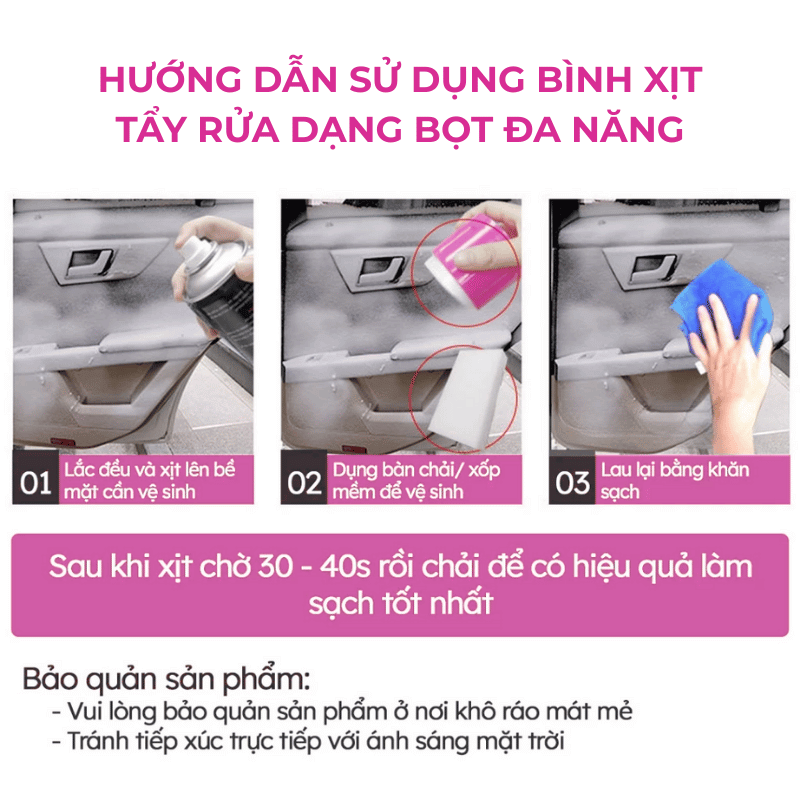 • Xịt trực tiếp lên khu vực cần vệ sinh, giữ khoảng cách 10-15 cm để bọt phủ đều bề mặt.