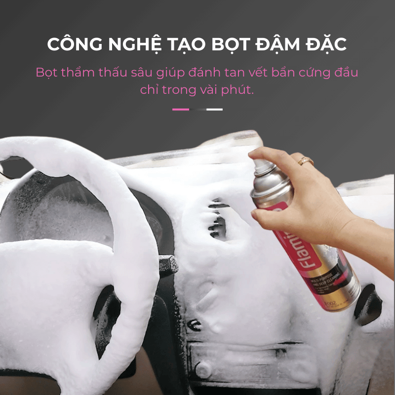 Flamingo F002 sử dụng cơ chế tạo bọt đậm đặc giúp bọt thấm sâu vào bề mặt, nhanh chóng phá vỡ cấu trúc vết bẩn như dầu mỡ, bùn đất, vết ố và bụi bám lâu ngày. Nhờ khả năng thẩm thấu tốt, sản phẩm hỗ trợ làm sạch nhanh hơn so với dạng nước xịt thông thường, tiết kiệm thời gian và công sức.