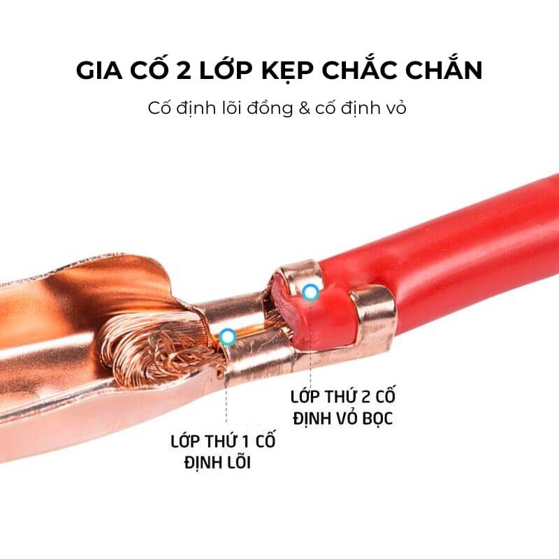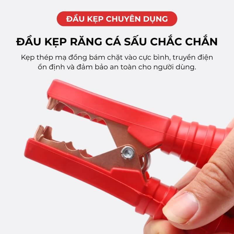 Kẹp cá sấu làm từ thép mạ đồng cho độ bám cao vào cực bình, hạn chế tuột hoặc tiếp xúc kém. Lò xo đàn hồi mạnh giúp dòng điện truyền liên tục, đảm bảo an toàn trong suốt quá trình câu bình, kể cả với người ít kinh nghiệm.