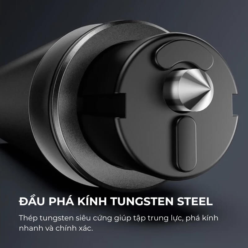 Phần đầu phá kính Baseus được làm từ thép tungsten siêu cứng, giúp tập trung lực vào một điểm nhỏ trên bề mặt kính. Thiết kế này giúp kính vỡ nhanh, giảm nguy cơ trượt tay và tăng độ chính xác khi thao tác trong không gian hẹp của xe.