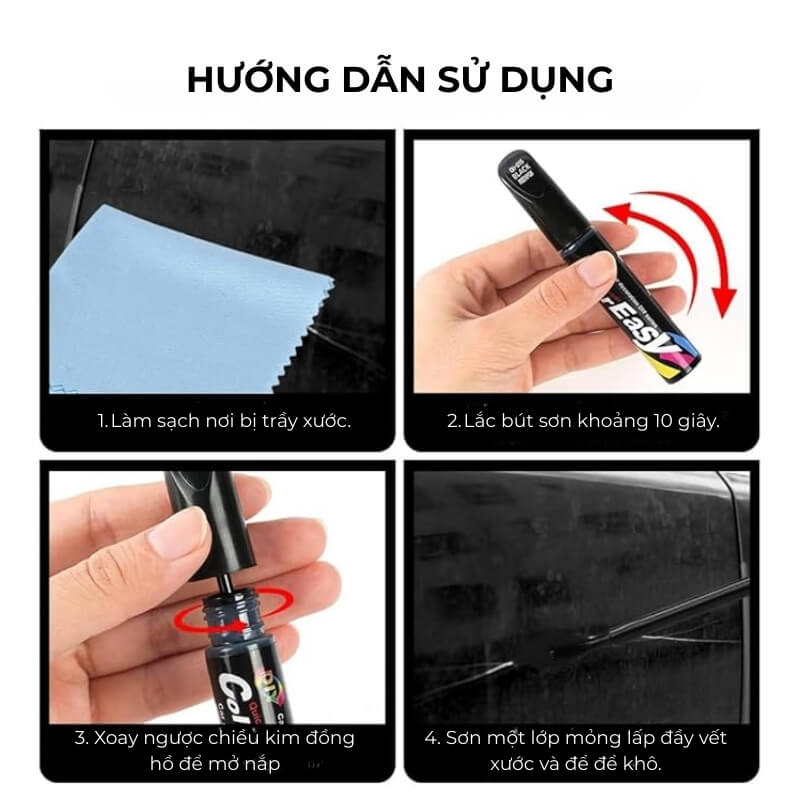Để bút xóa vết xước ô tô Color Easy phát huy tối đa hiệu quả, bạn cần thực hiện đúng quy trình và thao tác chuẩn. Dưới đây là hướng dẫn chi tiết giúp bạn xử lý vết trầy nhanh chóng ngay tại nhà.