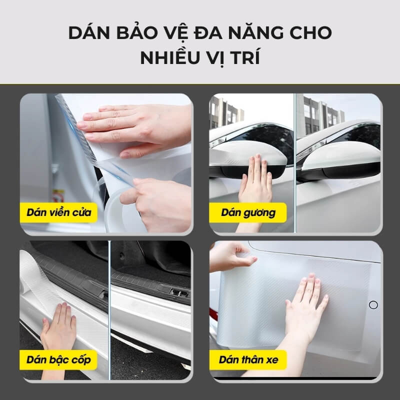 Sản phẩm giúp bảo vệ các vị trí dễ bị va chạm như mép cửa, bậc lên xuống, cốp xe khỏi trầy xước do va quệt, mở cửa hay để đồ. Nhờ đó, bề mặt xe luôn được giữ gìn gọn gàng và hạn chế hư hại trong quá trình sử dụng hằng ngày.