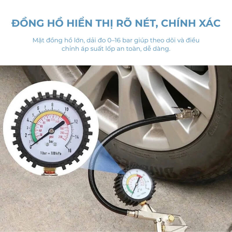 Đồng hồ kim có mặt hiển thị lớn, dễ quan sát và cho kết quả đo rõ ràng hơn so với cảm nhận bằng tay hay dùng đầu vòi thường. Dải đo rộng lên đến 0-16 bar giúp người dùng nắm được chính xác áp suất lốp để điều chỉnh phù hợp với từng loại xe. Nhờ vậy, việc bơm lốp trở nên an toàn và chuẩn xác hơn.