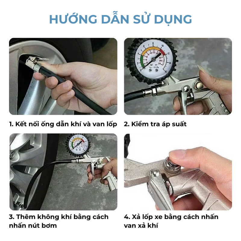Hướng dẫn chi tiết sử dụng đầu vòi bơm ô tô xe máy tích hợp đồng hồ đo áp suất