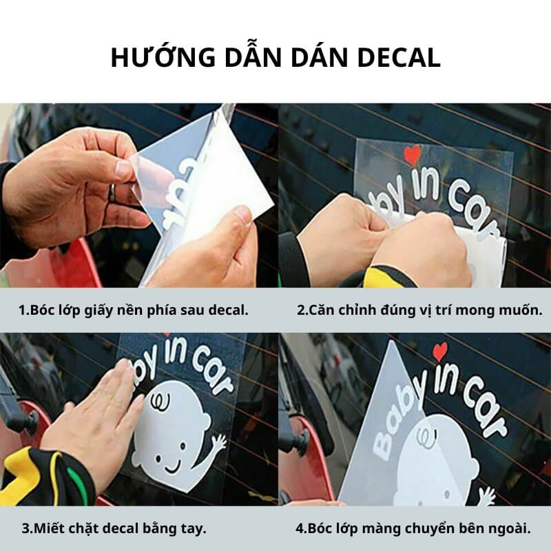 Việc dán decal tem Baby in Car rất đơn giản, không cần dụng cụ phức tạp nhưng vẫn đảm bảo decal bám chắc và đẹp nếu thực hiện đúng cách. Dưới đây là các bước hướng dẫn chi tiết giúp bạn dễ dàng tự dán tại nhà: