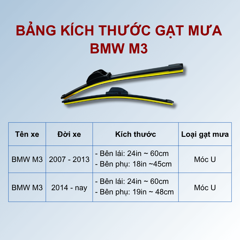 Để thay gạt mưa đúng loại cho BMW M3, bạn cần xác định chính xác năm sản xuất xe, vì kích thước và loại chân gạt có sự khác biệt giữa các đời. Dưới đây là bảng thông tin chi tiết:
