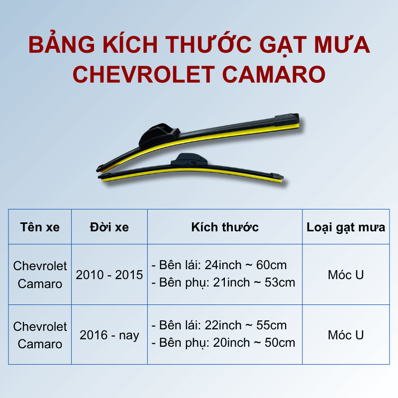 Việc lựa chọn kích thước gạt mưa phù hợp cho xe Chevrolet Camaro là rất quan trọng để đảm bảo gạt mưa hoạt động hiệu quả và không làm hư hại kính chắn gió. Dưới đây là bảng kích thước gạt mưa tiêu chuẩn cho các đời xe Chevrolet Camaro: