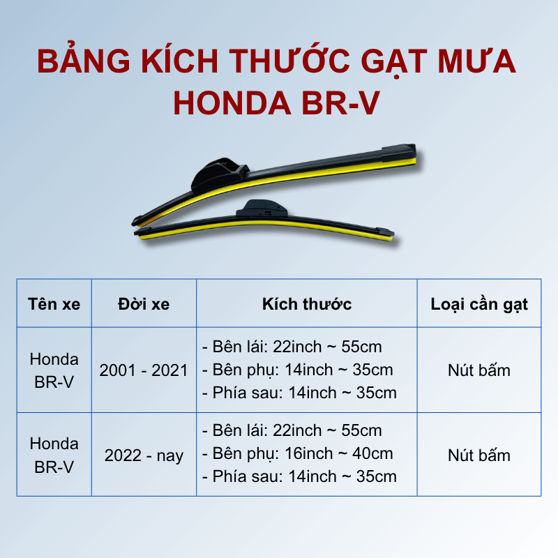 Kích thước gạt mưa có thể thay đổi tùy theo phiên bản cụ thể của từng đời xe Honda BR-V. Trước khi thay mới, bạn nên đo trực tiếp cần gạt trên xe hoặc tham khảo hướng dẫn sử dụng để đảm bảo lựa chọn đúng kích thước phù hợp. Việc sử dụng gạt mưa không đúng kích thước có thể ảnh hưởng đến hiệu quả làm sạch kính và tầm nhìn khi lái xe.