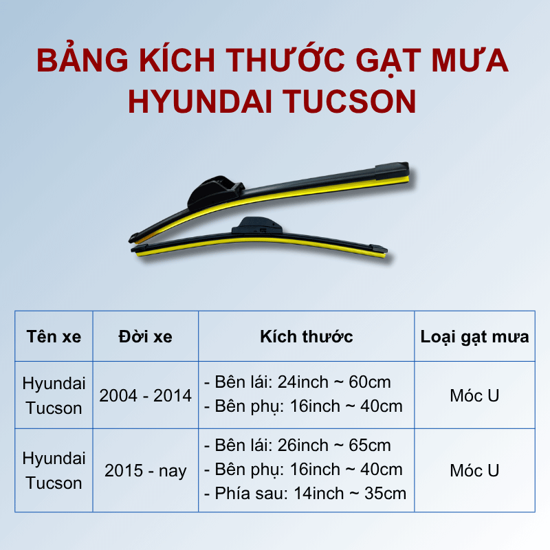Dưới đây là kích thước tiêu chuẩn cần gạt mưa cho các đời xe Hyundai Tucson mà bạn có thể tham khảo qua: