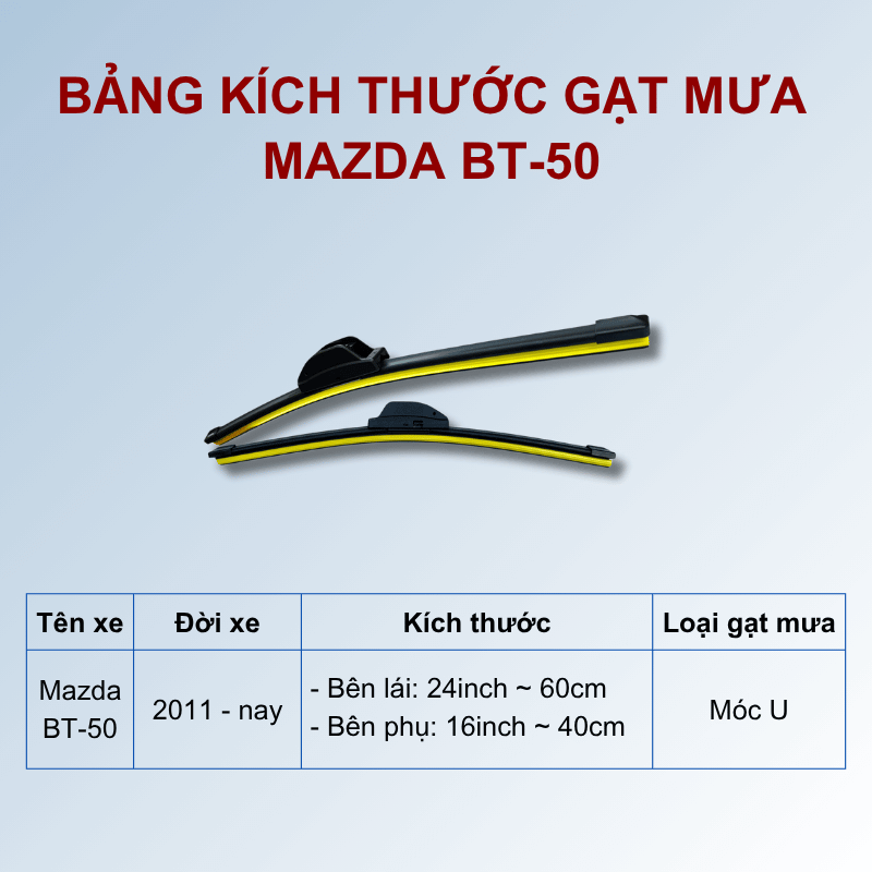 Lưu ý: Mazda BT-50 không trang bị gạt kính sau, vì là dòng bán tải cabin kép không có kính hậu kiểu SUV. Khi thay gạt mưa trước, chủ xe chỉ cần mua hai lưỡi dạng móc U để thuận tiện lắp đặt.