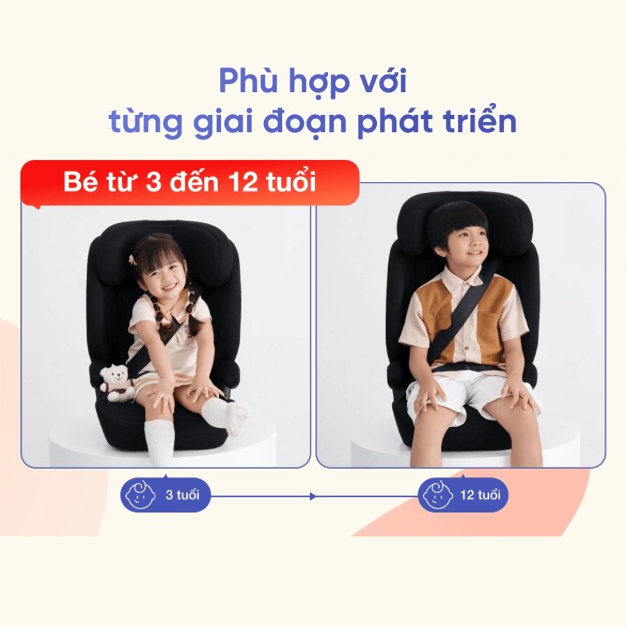 Nhờ biên độ điều chỉnh rộng, ghế luôn phù hợp cho bé từ giai đoạn nhỏ (khoảng 3 tuổi) đến khi bé lớn hẳn (12 tuổi), đảm bảo tư thế ngồi đúng chuẩn và giảm tình trạng mỏi cổ khi đi đường dài.