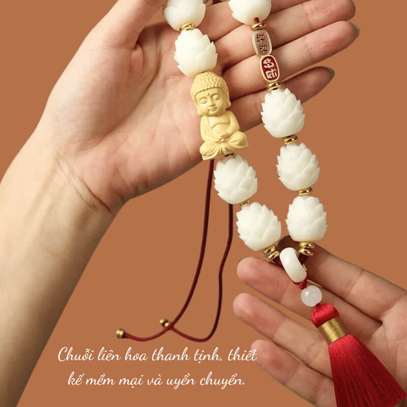 Chuỗi liên hoa được xâu kết theo dạng thả tự nhiên, tạo cảm giác uyển chuyển và nhẹ nhàng. Hoa sen là biểu tượng của sự thuần khiết và thanh tịnh, góp phần mang lại nguồn năng lượng an lành cho không gian nội thất xe.