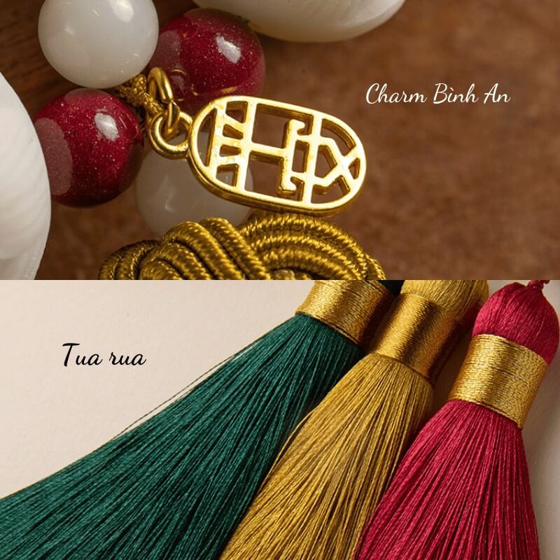 Hạt chu sa được xen kẽ hài hòa trong vòng liên hoa, mang nguồn năng lượng dương mạnh mẽ. Chu sa trong phong thủy thường được sử dụng để xua tan năng lượng tiêu cực, góp phần bảo hộ và giữ không gian xe luôn an yên.