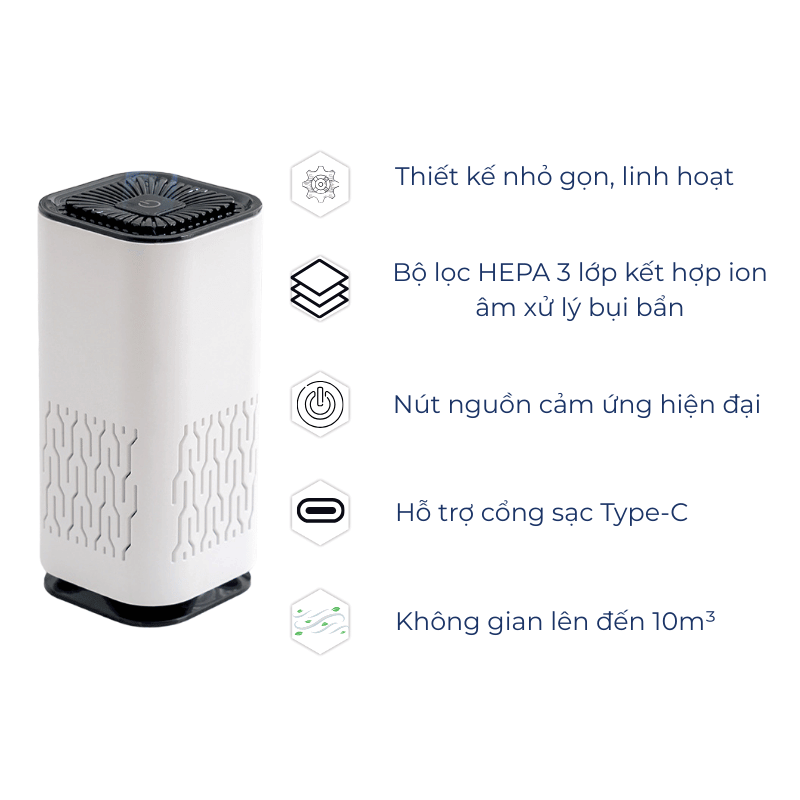 Máy trang bị bộ lọc HEPA ba lớp cao cấp giúp loại bỏ đến 99% bụi bẩn, phấn hoa, khói thuốc và những hạt siêu nhỏ từ 0.3 micron. Kết hợp cùng công nghệ ion âm, máy lọc không khí mini K2 Portable Air Purifier nhanh chóng trung hòa các mùi khó chịu trong xe như mùi ẩm mốc, mùi đồ ăn hay mùi điều hòa cũ. Đặc biệt, khả năng lọc bụi mịn PM2.5 giúp cải thiện rõ rệt chất lượng không khí, phù hợp cho người dị ứng hoặc người nhạy cảm với môi trường kín.