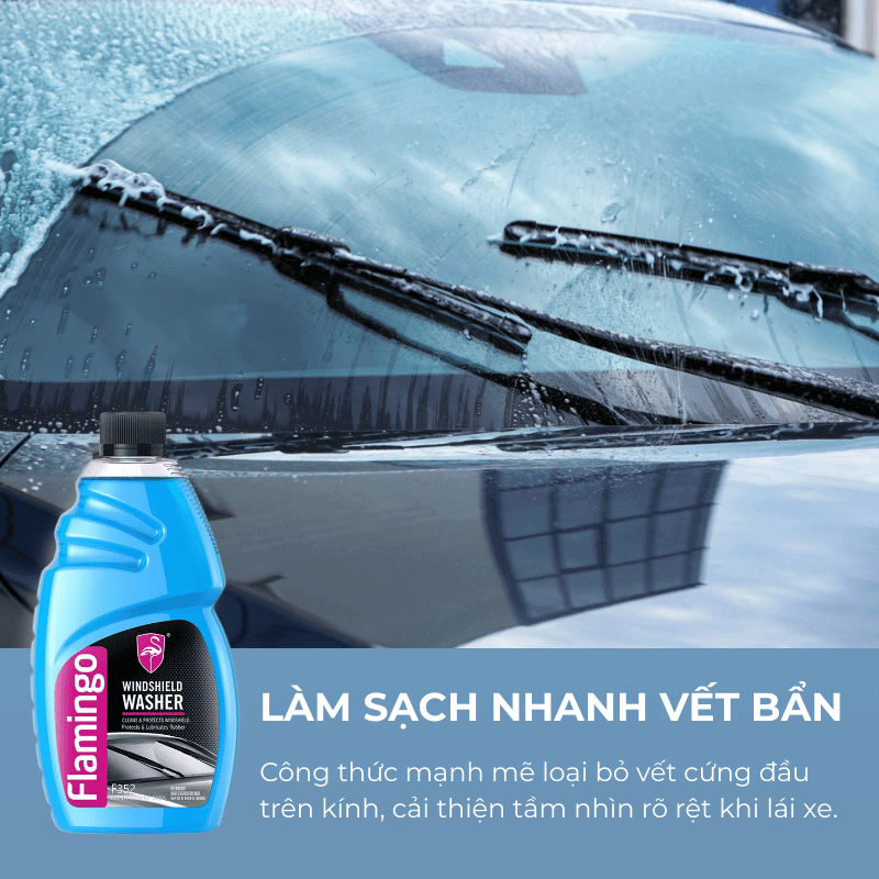 Flamingo F352 có khả năng đánh bay các vết bẩn như dầu mỡ, bụi đường, cặn nước mưa và vệt ố bám lâu ngày mà nước thường không thể xử lý. Công thức làm sạch mạnh mẽ giúp bề mặt kính trở nên sáng trong chỉ sau vài đường gạt, hỗ trợ tối đa khi lái xe dưới trời mưa hoặc ban đêm.