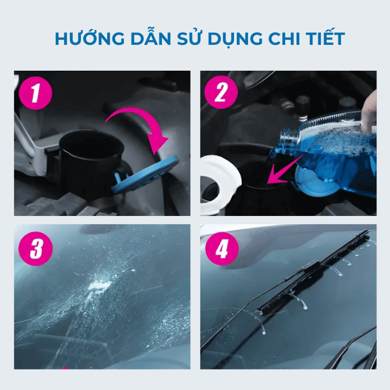 - Không đổ dung dịch trực tiếp lên kính, sản phẩm được thiết kế để sử dụng qua hệ thống phun kính nhằm phân bổ đều và tránh hao phí.