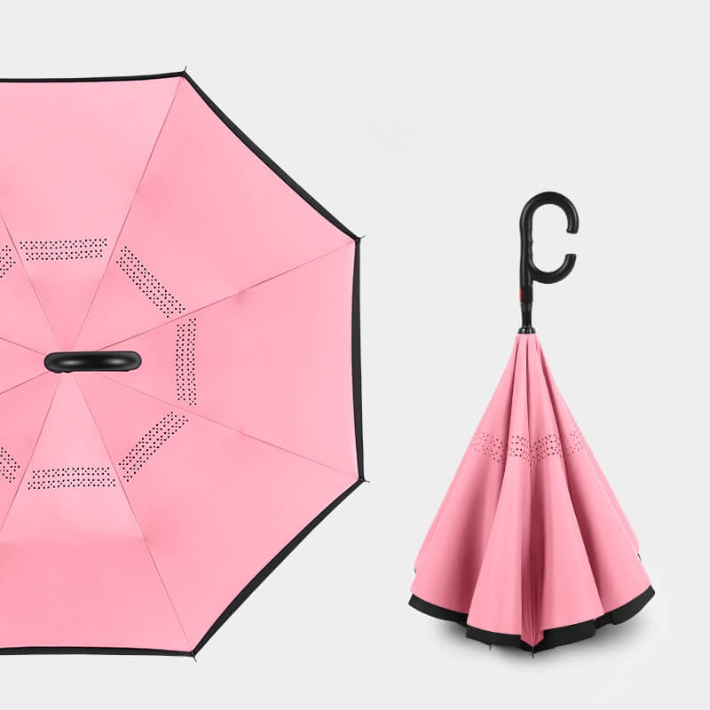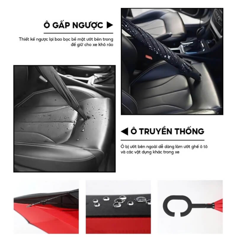 Thiết kế gấp ngược cho phép ô mở vào trong thay vì hướng ra ngoài như ô truyền thống. Điều này giúp hạn chế nước mưa nhỏ xuống người hoặc lọt vào bên trong xe khi mở cửa. Với cơ chế này, người dùng có thể mở ô ngay khi vừa hé cửa xe và bước ra ngoài mà vẫn khô ráo. Tính năng đặc biệt này chính là lý do khiến ô gấp ngược rất được ưa chuộng bởi tài xế ô tô.