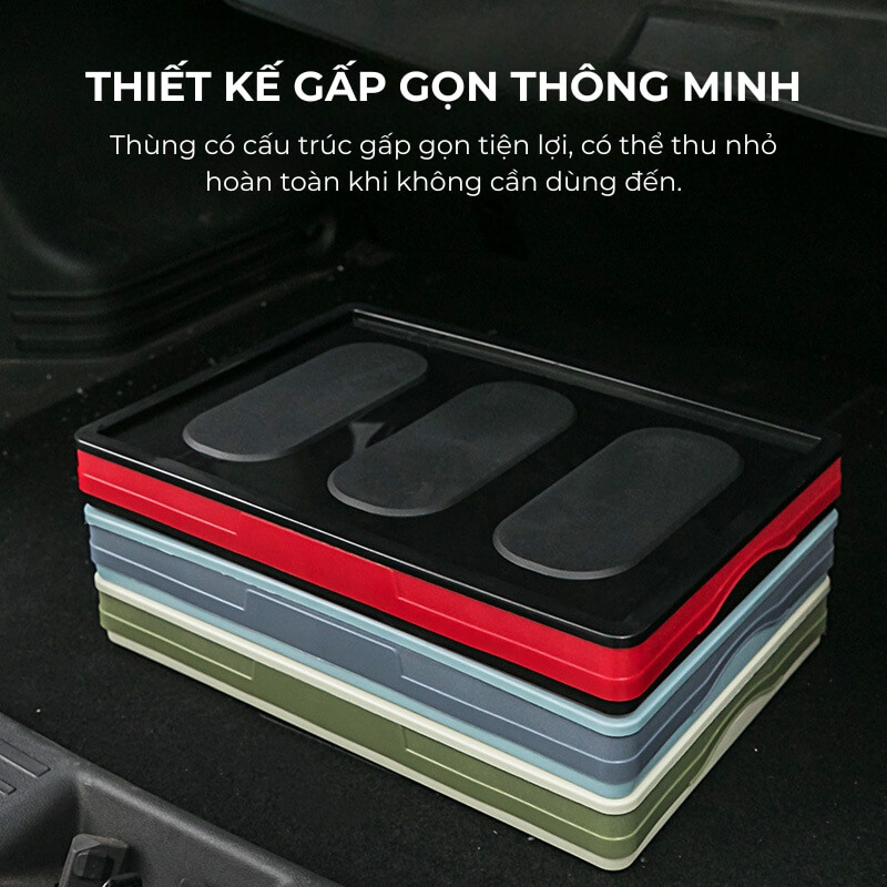 Thùng có cấu trúc gấp gọn tiện lợi, có thể thu nhỏ hoàn toàn khi không cần dùng đến. Điều này giúp tiết kiệm diện tích cốp xe đáng kể và phù hợp cho mọi dòng xe, kể cả những mẫu có khoang hành lý nhỏ. Khi cần sử dụng, bạn chỉ cần bung thùng ra và cố định trong vài giây.