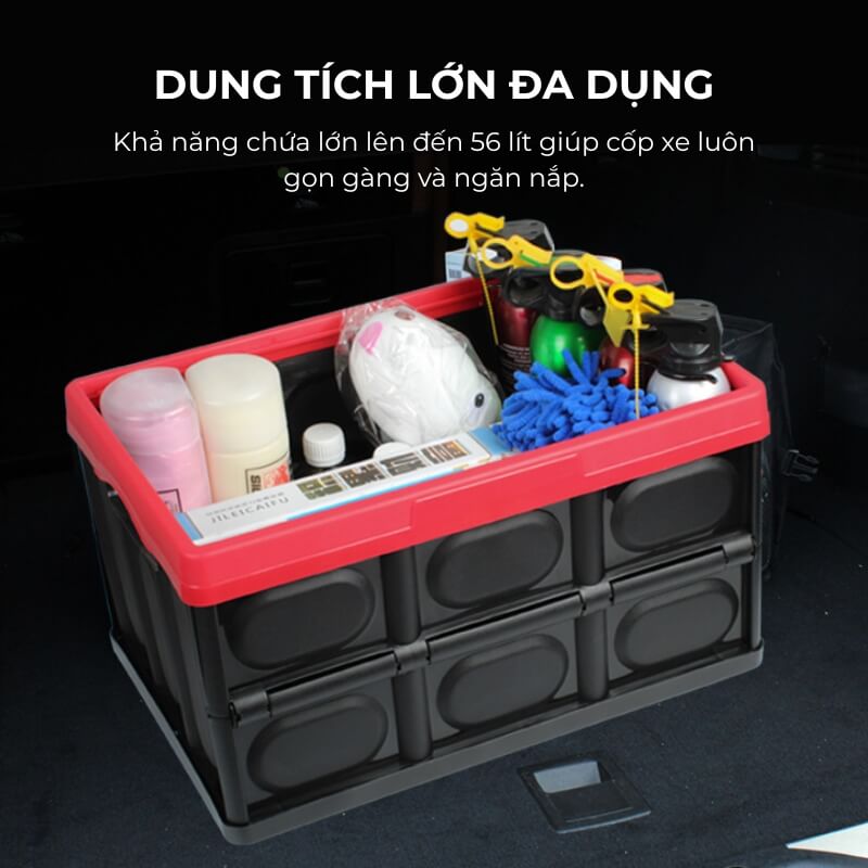 Với dung tích lên đến 56 lít, thùng có thể dễ dàng chứa các vật dụng như đồ sửa xe, phụ kiện, nước uống, quần áo, giày dép, đồ đi du lịch hoặc đồ cho trẻ em. Khả năng chứa lớn giúp cốp xe luôn gọn gàng và ngăn nắp, đặc biệt trong những chuyến đi xa cần mang theo nhiều hành lý.